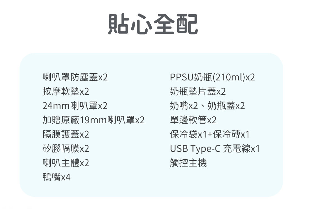 ◆ 貼心全配:多尺寸喇叭罩、PPSU奶瓶、保冷袋(磚)